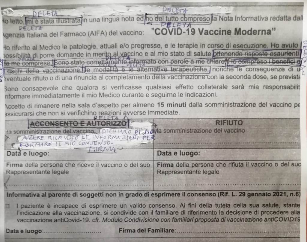 consenso che si può firmare soltanto dopo avere accuratamente carcerato tutte le frasi indicate nella foto allegata